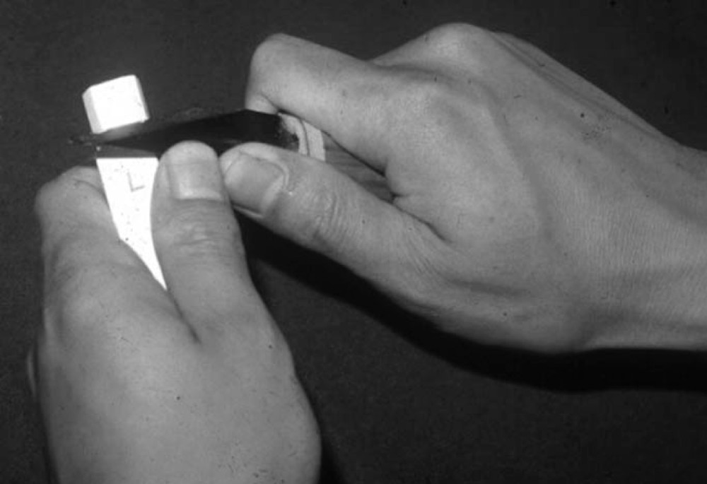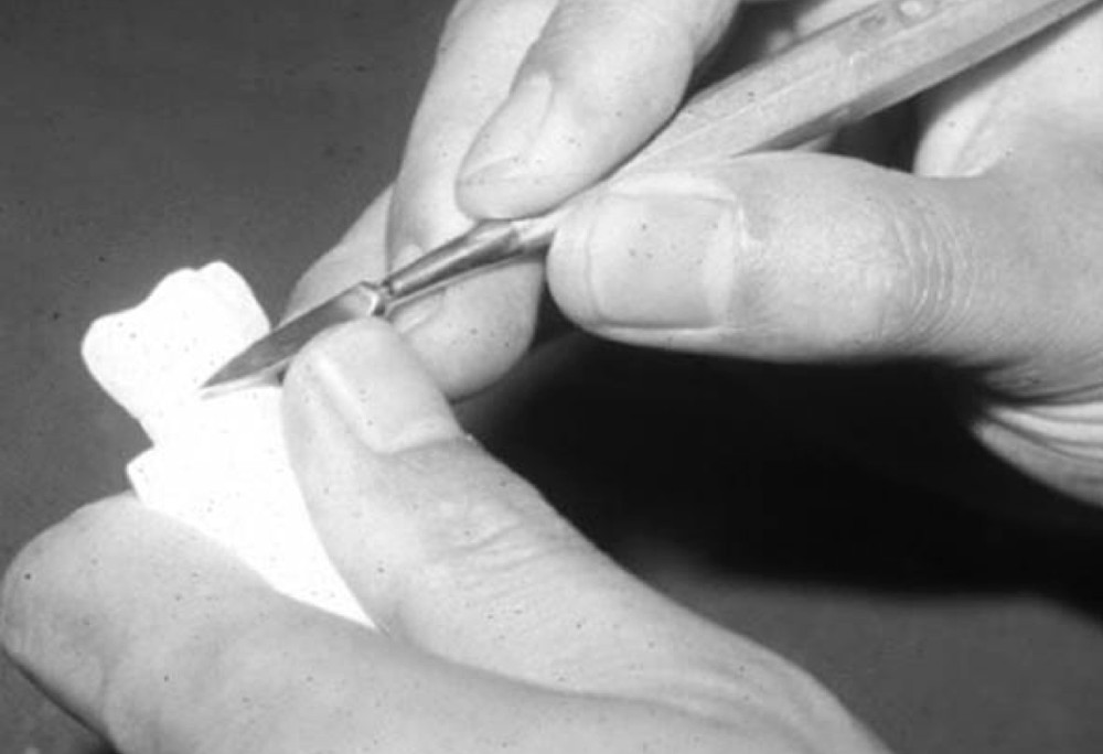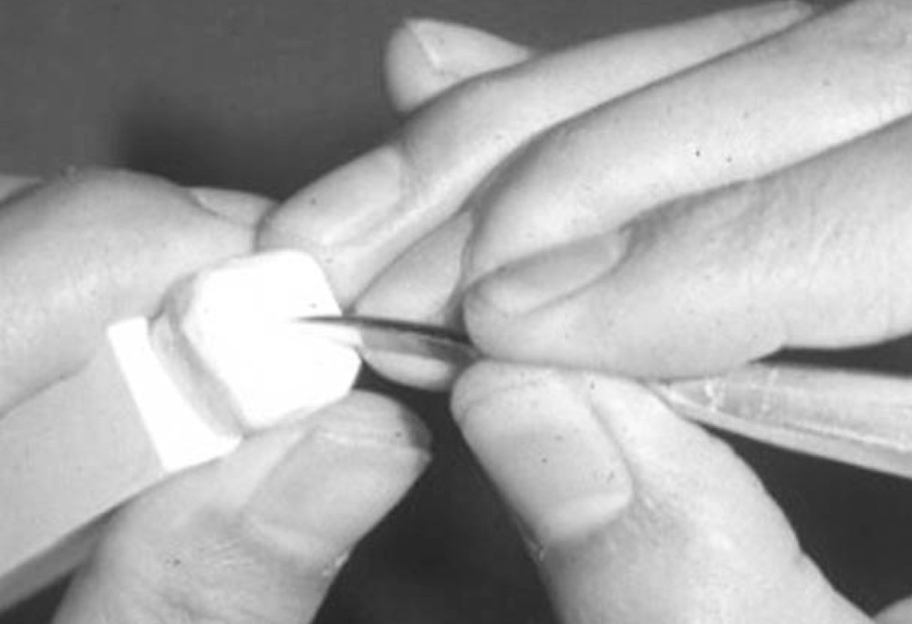 最初は切り出しナイフを用いて、大きくワックスをカットし、大雑把な歯形を作る。その際、切り出しナイフを自分の指、手や身体に向けず、切り出しナイフの動きを十分にコントロールできる姿勢(フィンガーレスト等)で慎重に行うこと(図2a, b)。