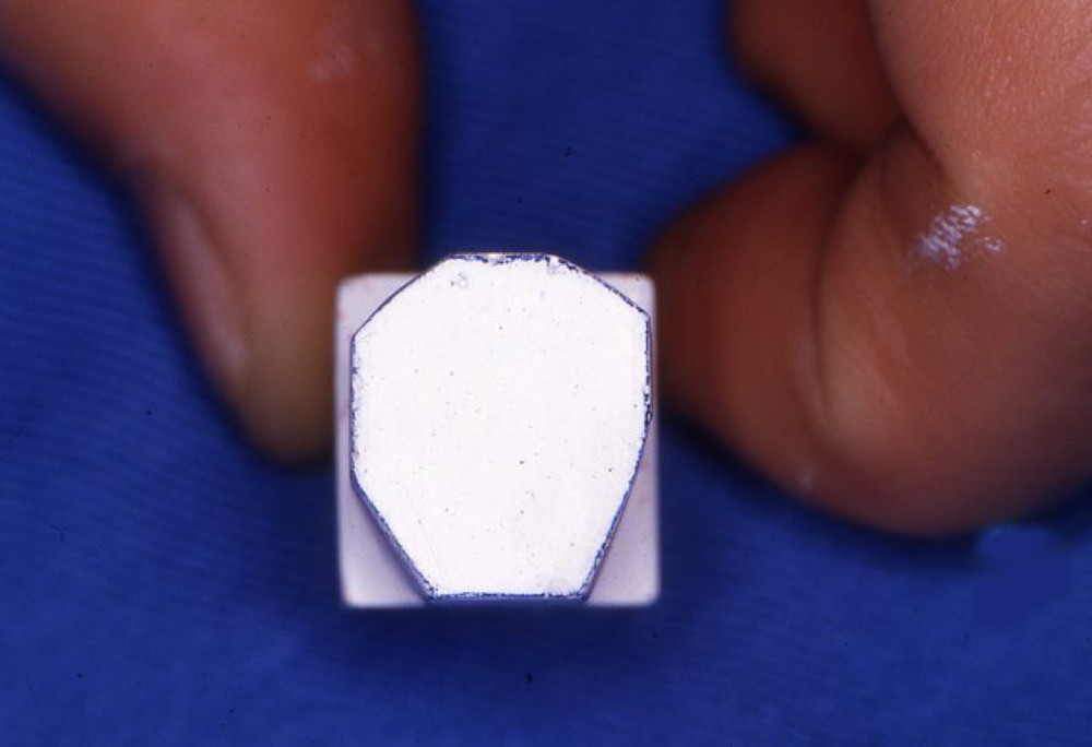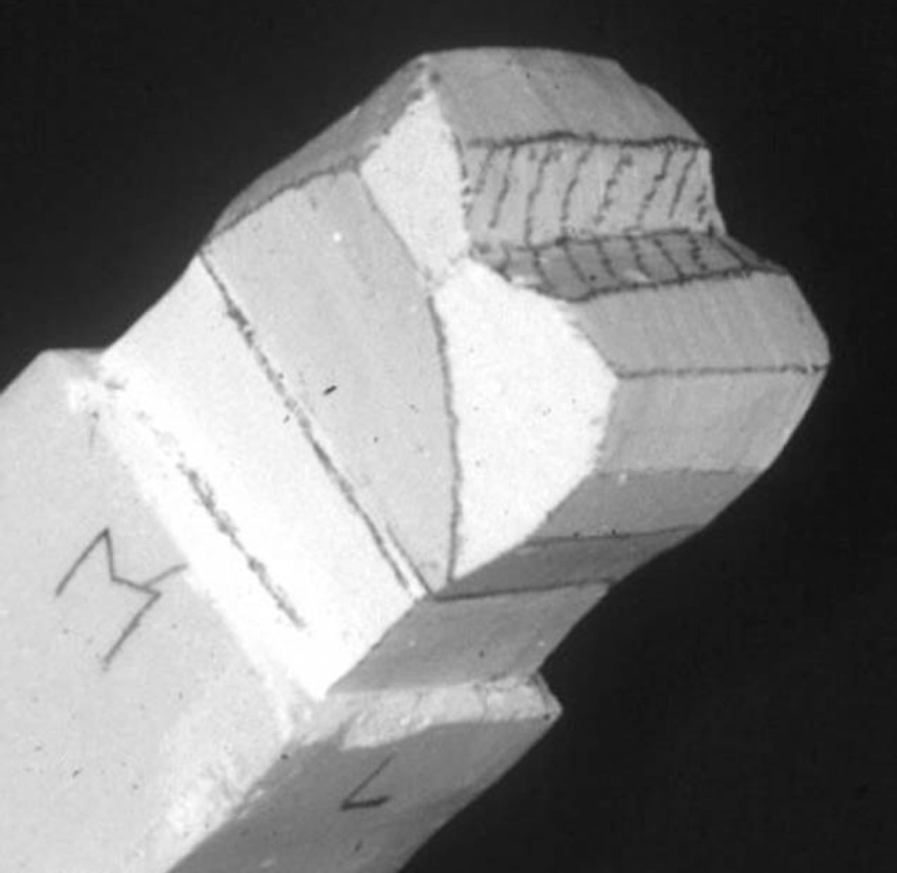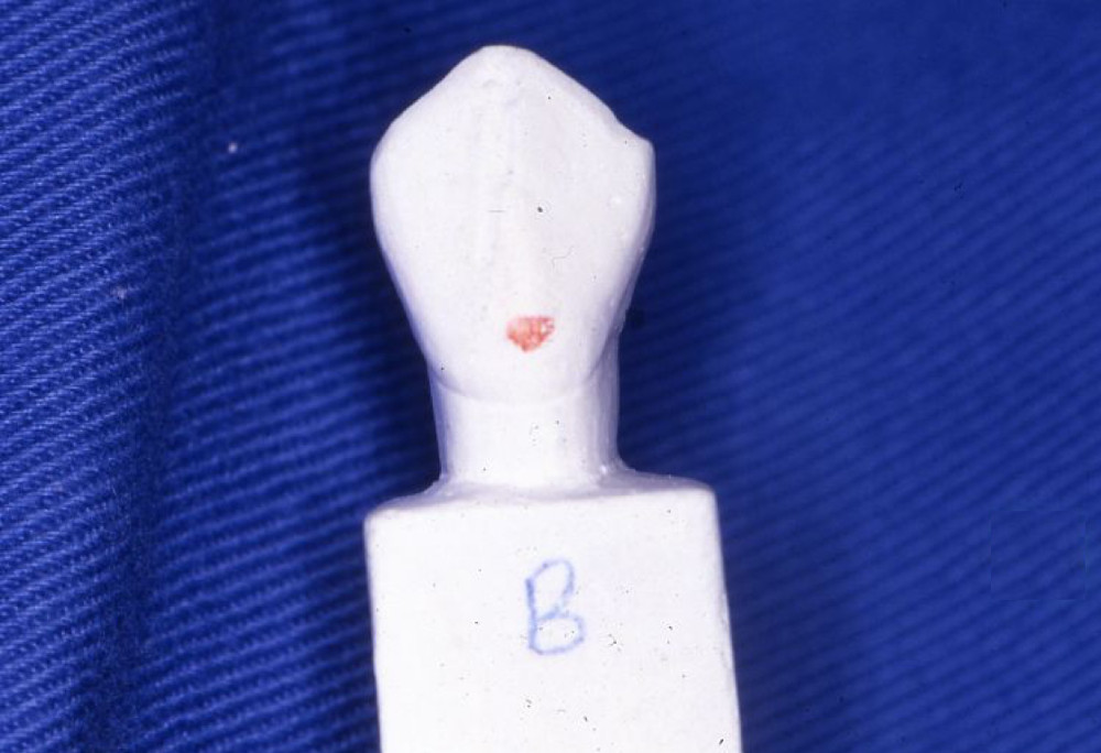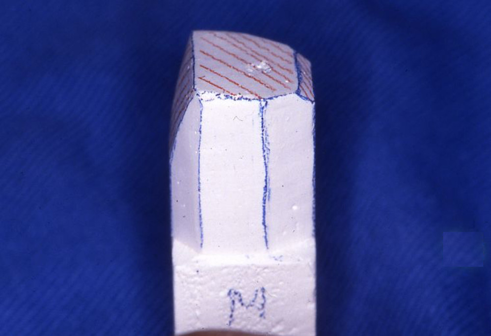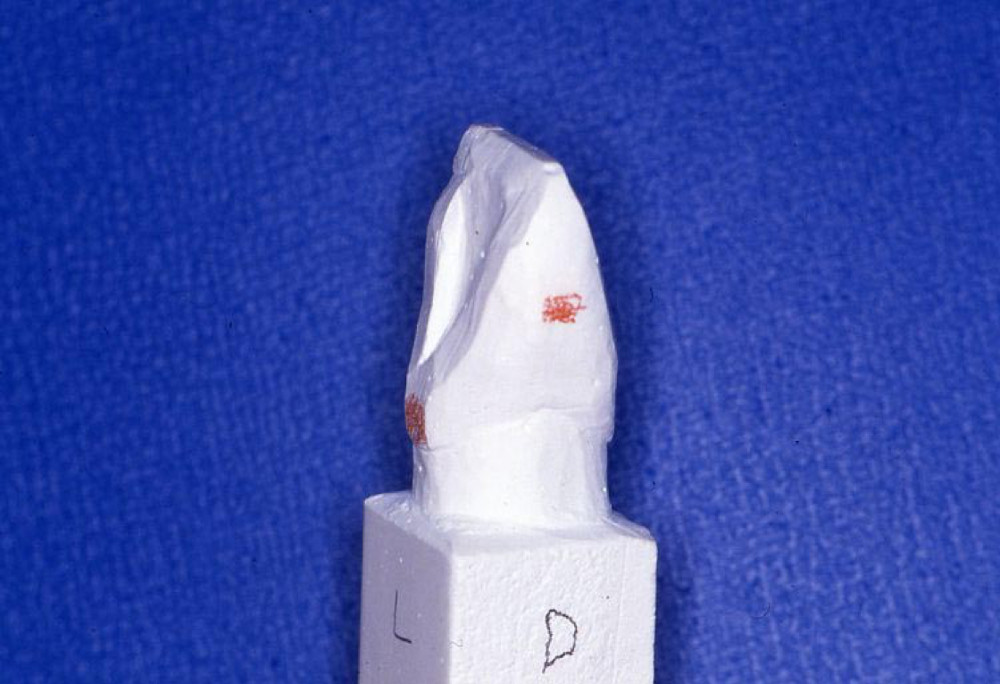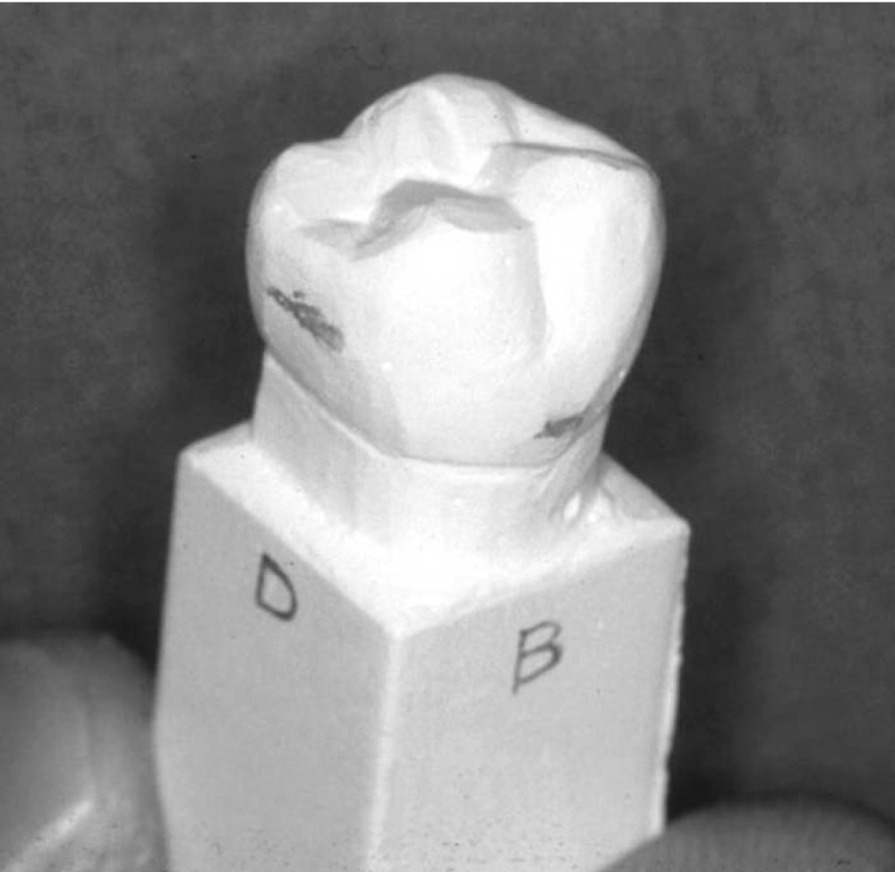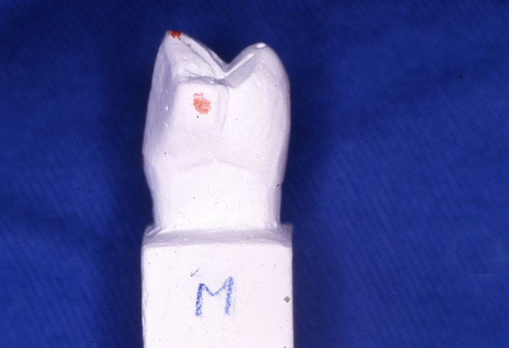 実習の参考模型である。この模型の形、寸法、特徴などをよく観察して、ワックスにて類似するものを再現する。ただし、彫刻のサイズを問わず、バランスがとれていることを重視する。一般的に報告されている形態と違いがあっても、臨床歯冠形態に個人差があることから、今回はこの模型の形態を優先する。