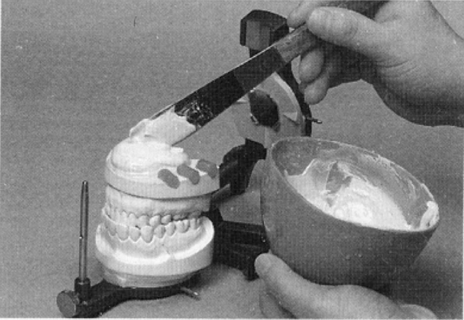作業中に削ったワックス屑を豚毛ブラシにて撤去し、歯形が再現されたら、ガーゼ、ストッキング等で仕上げ研磨を行う。